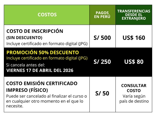 Los costos del curso varían según el lugar de residencia del participante (dentro o fuera de Perú):